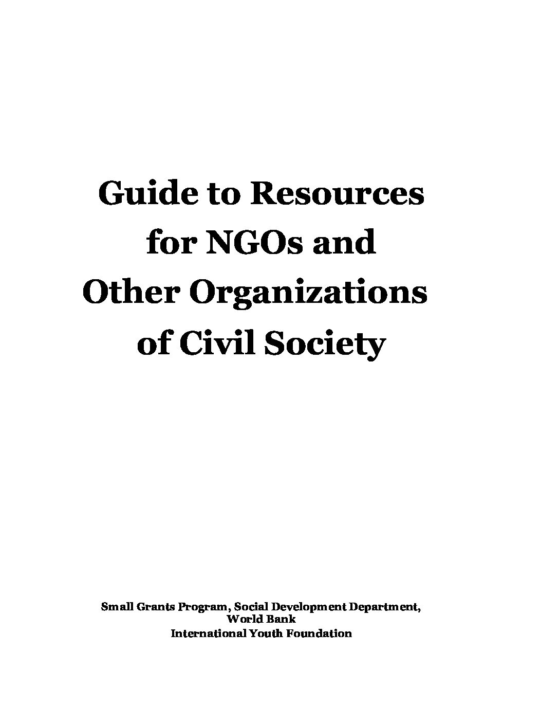 The World Bank acknowledges the importance of the engagement of civil society in development. In order for organizations to facilitate their involvement in development, the Small Grants Program has produced this publication in partnership with the International Youth Foundation. This publication is a web-based guide to technical and financial resources for NGOs and other organizations of civil society