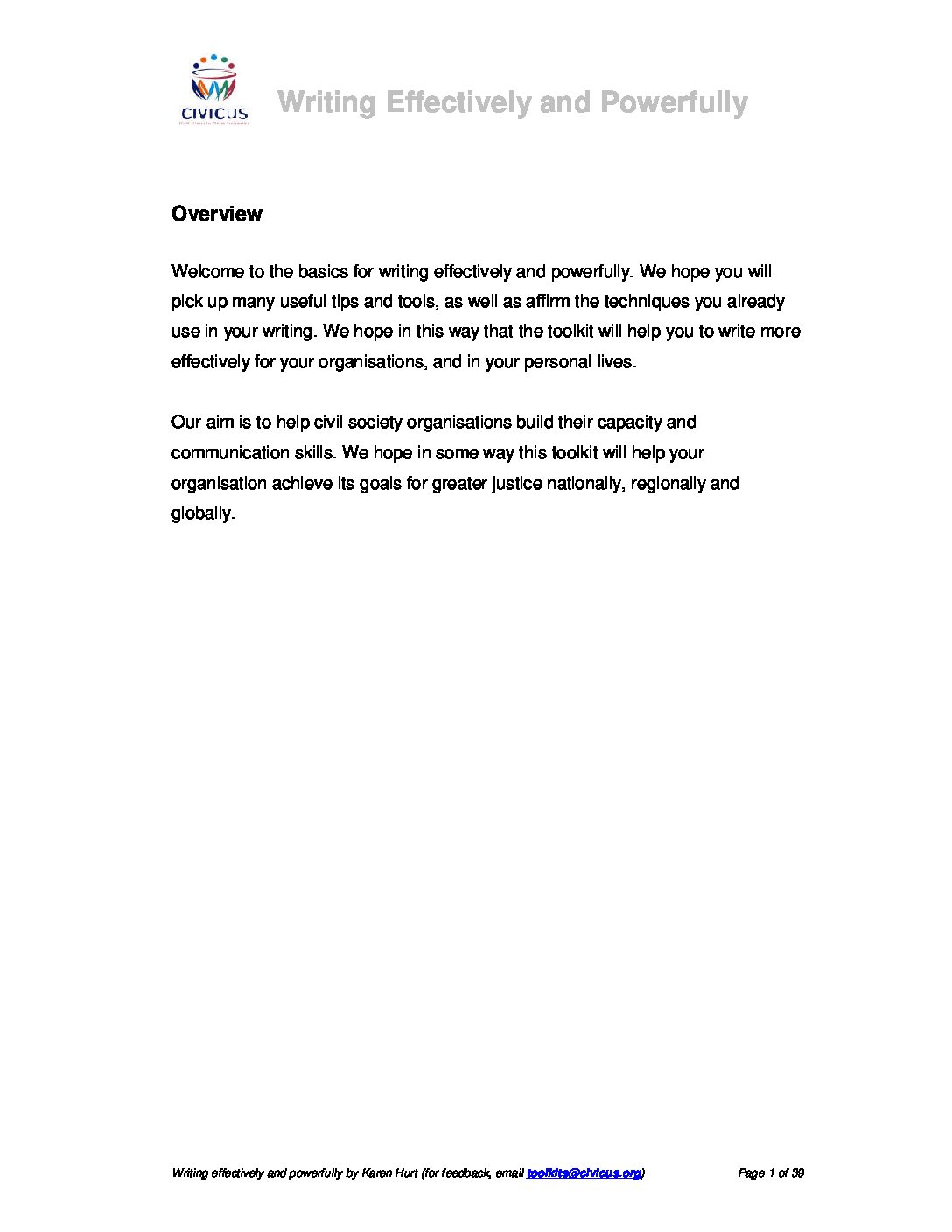 Welcome to the basics for writing effectively and powerfully. We hope you will pick up many useful tips and tools, as well as affirm the techniques you already use in your writing. We hope in this way that the toolkit will help you to write more