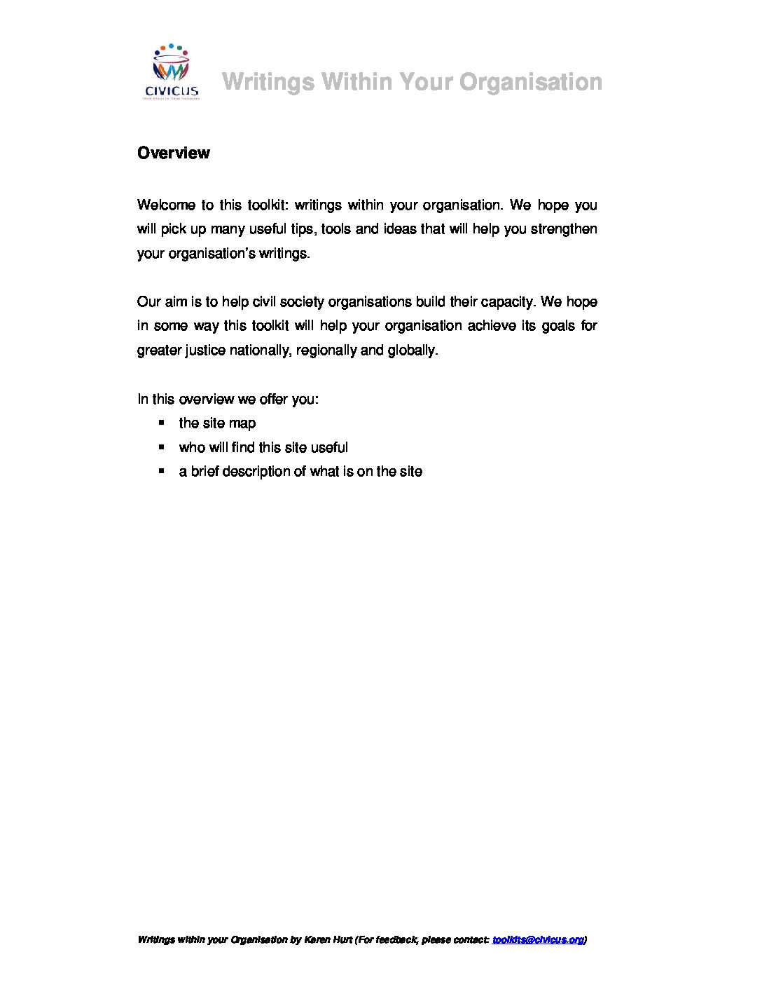 Our aim is to help civil society organisations build their capacity. We hope in some way this toolkit will help your organisation achieve its goals for